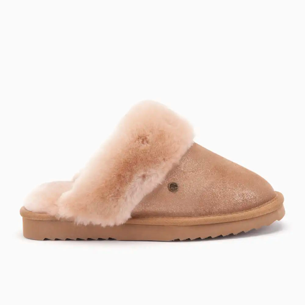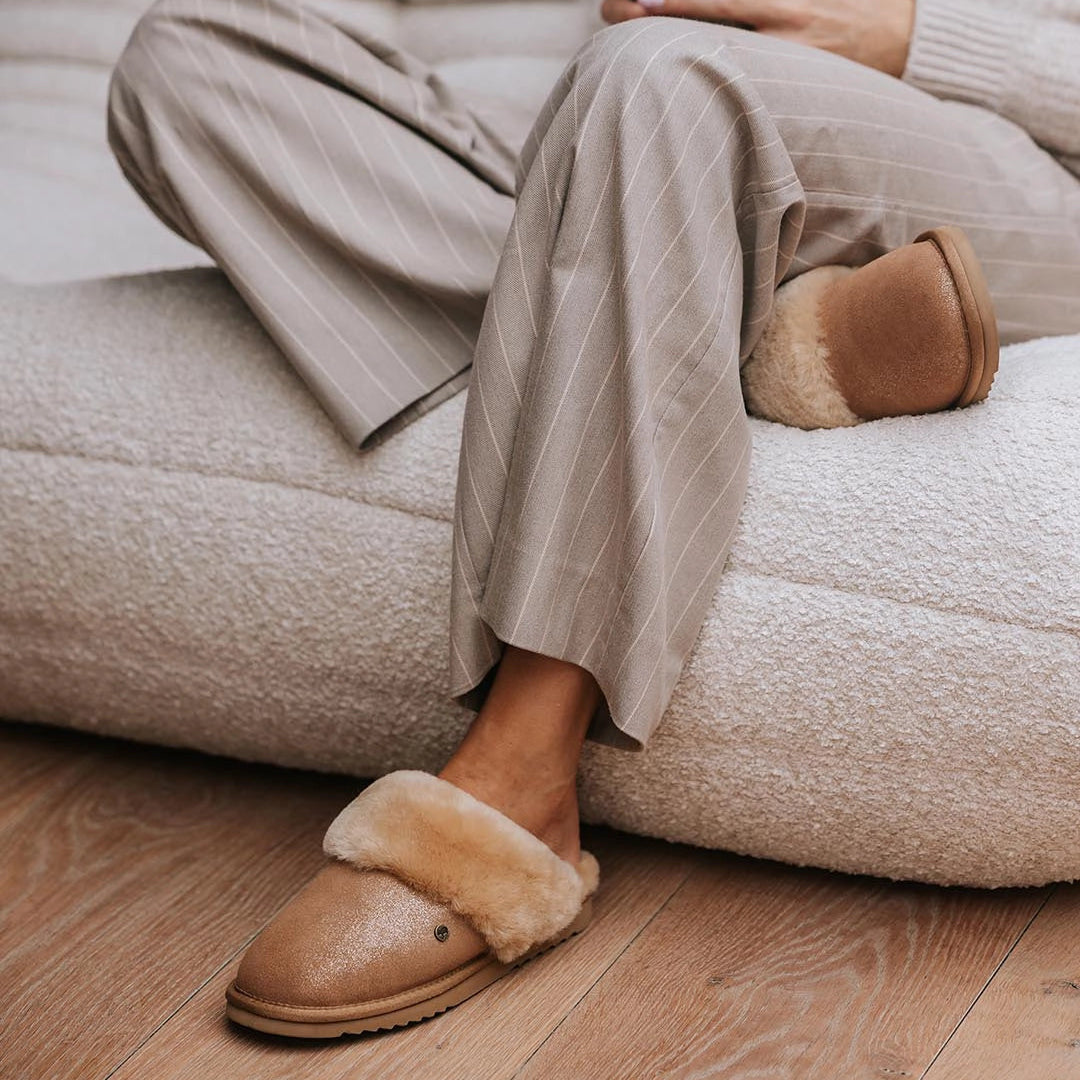 Suchen Sie originelle und einzigartige Hausschuhe für Damen? Dann haben Sie mit diesen Warmbat Collie Metallic-Hausschuhen das perfekte Paar gefunden. Diese Hausschuhe haben ein einzigartiges Metallic-Finish. Diese lässigen Slipper haben außerdem ein wunderbar weiches Futter. So können Sie zu Hause bequem und stilvoll herumlaufen! Warmbat-Hausschuhe sind für ihren wunderbar feinen Kern aus Merinoschafwolle bekannt. Und das aus gutem Grund. Schafwolle ist weich, elastisch und von Natur aus thermostatisch. Das bedeutet, dass Ihre Füße nie zu heiß oder zu kalt sind, sondern immer die perfekte Temperatur haben. Darüber hinaus sorgt die Wollqualität für trockene Füße, unabhängig von der Umgebungstemperatur. Diese bequemen Hausschuhe haben außerdem eine Außenhaut aus Leder und eine rutschfeste Sohle aus EVA (Ethylenvinylacetat) und Gummi.
