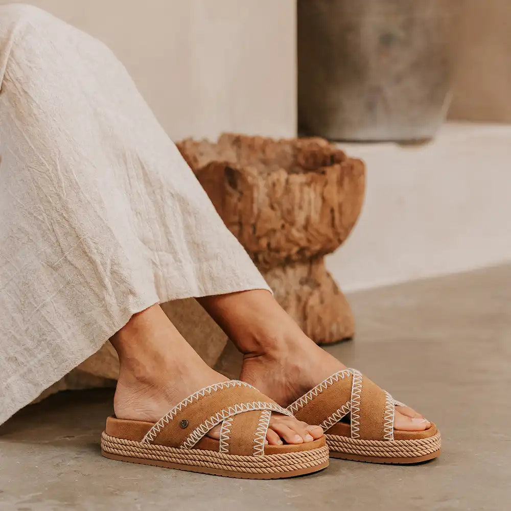 Die Warmbat Nullagine Damensandale aus Cognac-Wildleder ist eine stilvolle und bequeme Wahl für Frühling und Sommer. Gefertigt aus hochwertigem Cognac-Wildleder bietet diese Sandale einen zeitlosen Look, der viele Sommeroutfits perfekt ergänzt. Die Mikrofaser-Innensohle sorgt für zusätzlichen Komfort, während die leichte und flexible EVA-Laufsohle für langanhaltenden Tragekomfort sorgt. Erhältlich in den Größen 36 bis 42, ist diese Sandale ideal für den Alltag und bietet die perfekte Kombination aus Stil und Funktionalität.