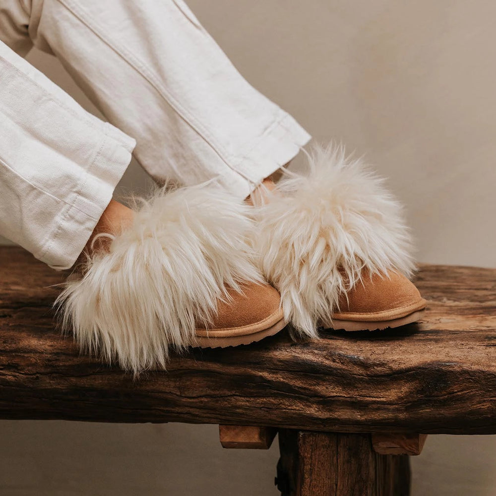 Die Wagga Plateau-Slipper sind die ideale Wahl für alle, die modische und bequeme Hausschuhe für zu Hause suchen. Ihr elegantes Design, das weiche Schaffell und die trendige Plateausohle machen sie perfekt für einen entspannten Tag mit Stil.